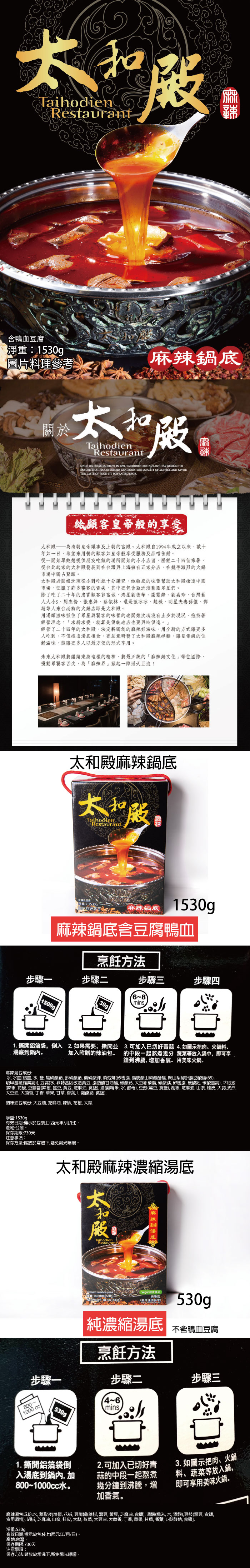 太和殿精心製作,開封加熱即食火鍋湯底,讓人如臨現場享用的麻辣火鍋,採用十多種辛香料熬煮,獨門祕製醬料配方,堅持純手工炒製,湯底重麻、重香氣,