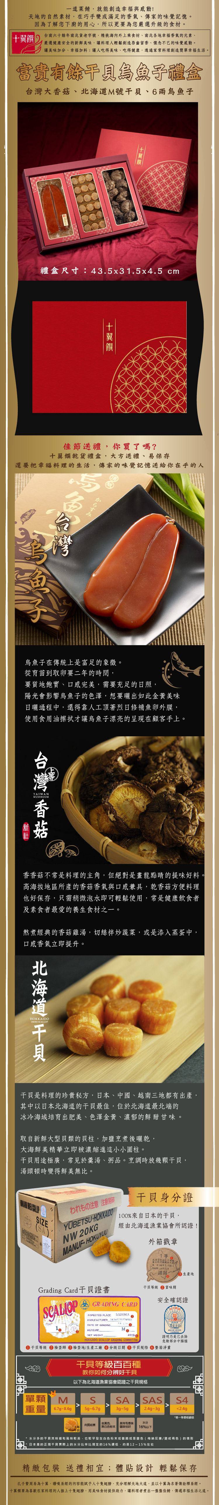 內容物:台灣六兩烏魚子 1片、台灣大香菇 75g、北海道M號干貝 135g