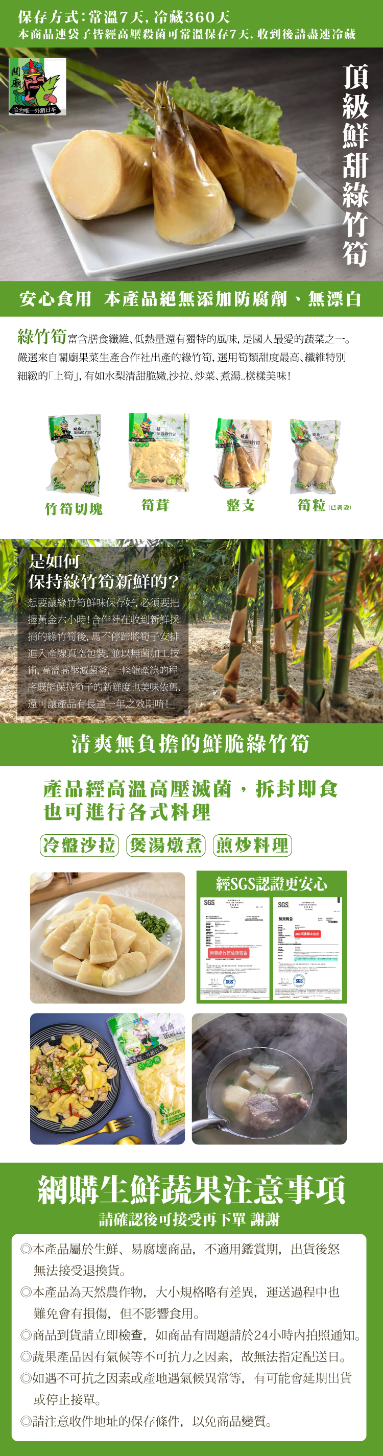 綠竹筍富含膳食纖維、低熱量還有獨特的風味,是國人最愛的蔬菜之一。嚴選來自關廟果菜生產合作社出產的綠竹筍,選用筍類甜度最高、纖維特別細緻的「上筍」,有如水梨清甜脆嫩,沙拉、炒菜、煮湯..樣樣美味!