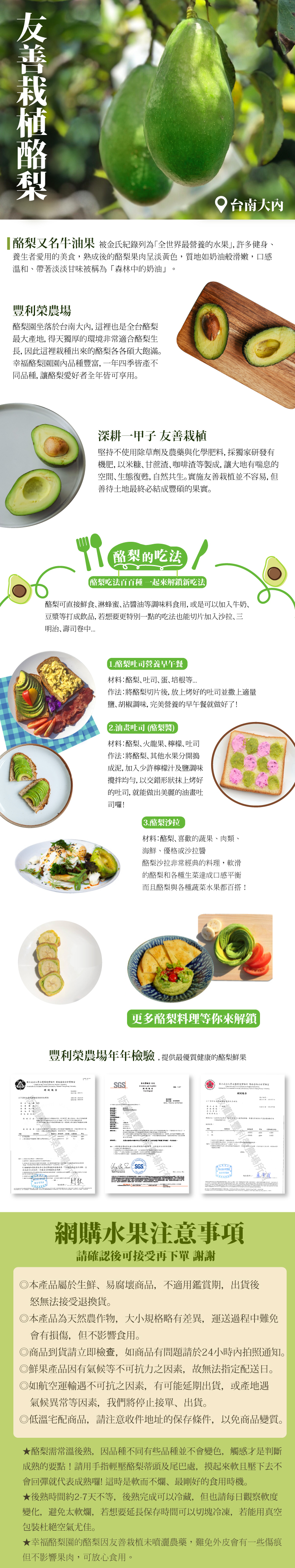 酪梨園坐落於台南大內,這裡也是全台酪梨最大產地,得天獨厚的環境非常適合酪梨生長,因此這裡栽種出來的酪梨各各碩大飽滿。幸福酪梨園園內品種豐富,一年四季皆產不同品種,讓酪梨愛好者全年皆可享用。