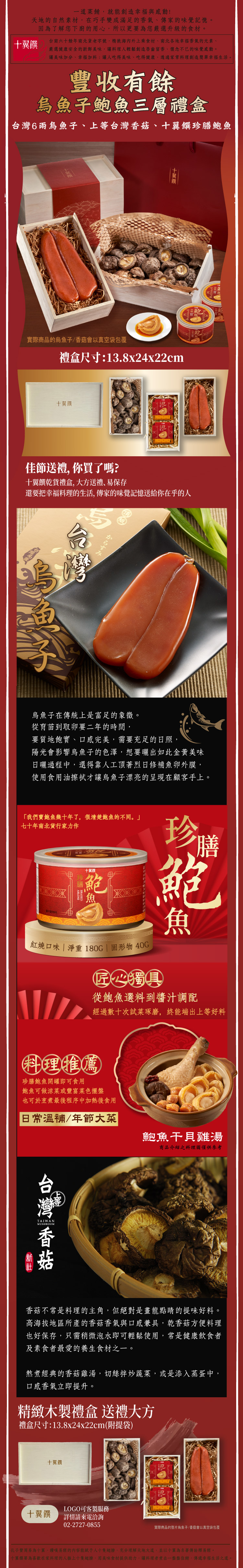 內容物:台灣6兩烏魚子、十翼饌珍膳鮑魚180gx2罐、台灣香菇75g(可加$20改臘腸250g)