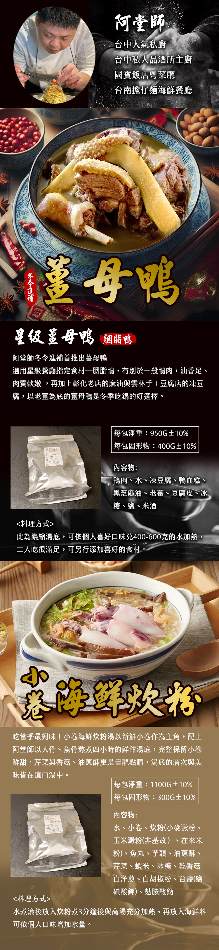 阿堂師冬令進補首推出薑母鴨 選用星級餐廳指定食材—胭脂鴨,有別於一般鴨肉,油香足、 肉質軟嫩 ,再加上彰化老店的麻油與雲林手工豆腐店的凍豆 腐,以老薑為底的薑母鴨是冬季吃鍋的好選擇。