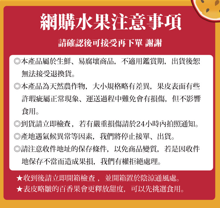 依據「通訊交易解除權合理例外情事適用準則」第2條第一項:「易於腐敗、保存期限較短或解約時即將逾期」之商品,屬於消費者保護法第19條第一項但書所稱合理例外情事。自105年1月1日起,生鮮食品不適用於消費者保護法第19條,並不享有7天鑑賞期,因冷藏食品或生鮮商品屬消耗性商品,商品屬性特殊或有保存期限等問題,除商品本身瑕疵或運送過程而造成的損毀,才可接受您的退貨申請。非商品瑕疵恕無法為您辦理退換貨,下單前請務必考慮、詢問清楚!一經拆封、食用、失溫及保存不良等情形而導致商品變質,則無法處理您的退換貨申請,敬請見諒!
