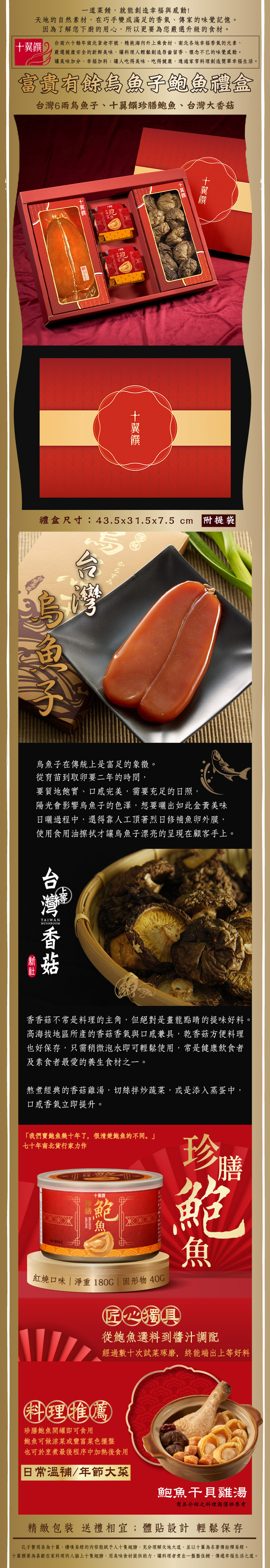 內容物:台灣6兩烏魚子、台灣香菇75g、十翼饌珍膳鮑魚180gx2罐