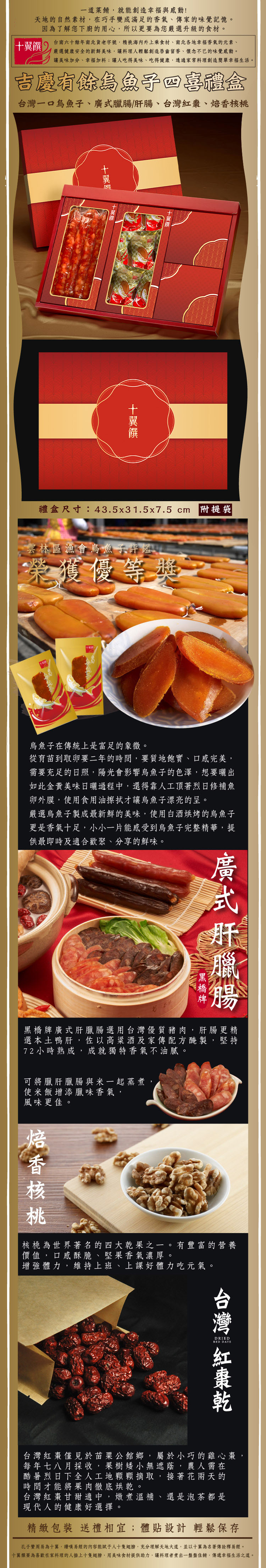 內容物:一口烏魚子85g、廣式臘腸/肝腸共500g(台灣豬)、台灣紅棗90g、焙香核桃110g