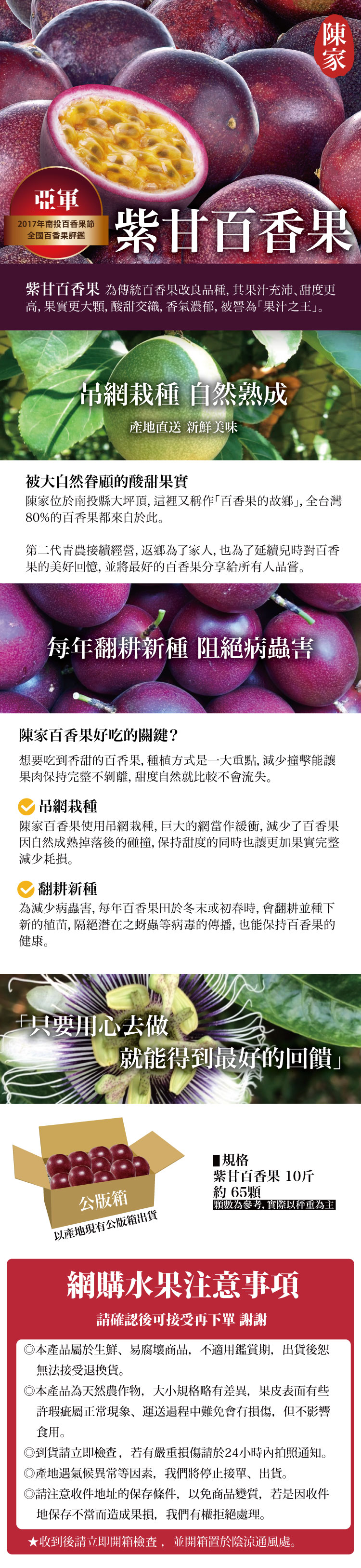 紫甘百香果 為傳統百香果改良品種,其果汁充沛、甜度更高,果實更大顆,酸甜交織,香氣濃郁,被譽為「果汁之王」。濃郁的天然香氣、酸甜可口的美麗果實。