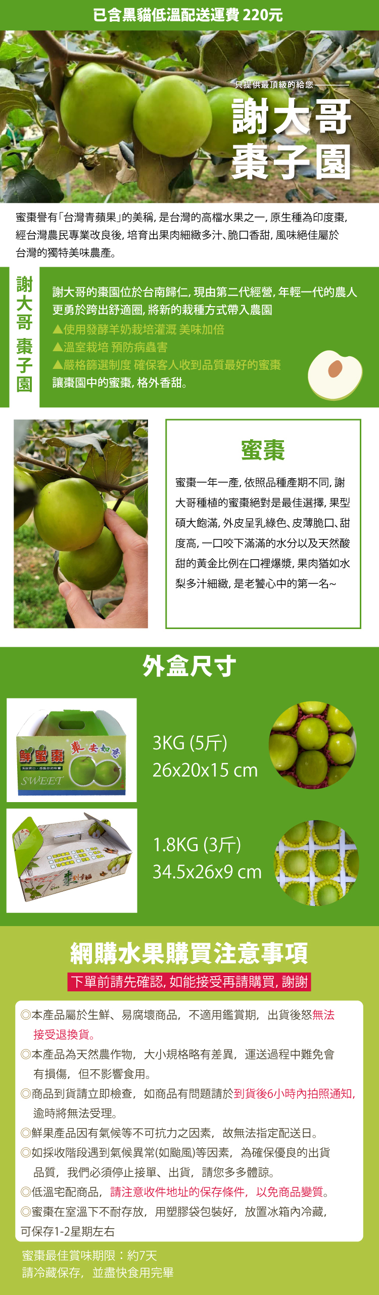 蜜棗譽有「台灣青蘋果」的美稱,是台灣的高檔水果之一。謝大哥的棗園位於台南歸仁,在這個追求美味與品質的時代,棗子以其嚴謹的挑選標準和獨特的品牌理念,為你呈現了一場與自然相連的美妙饗宴。